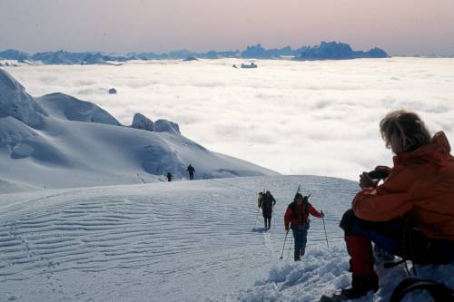 rugged, glacier-covered mountains tower to over 7000 feet (2150 meters).